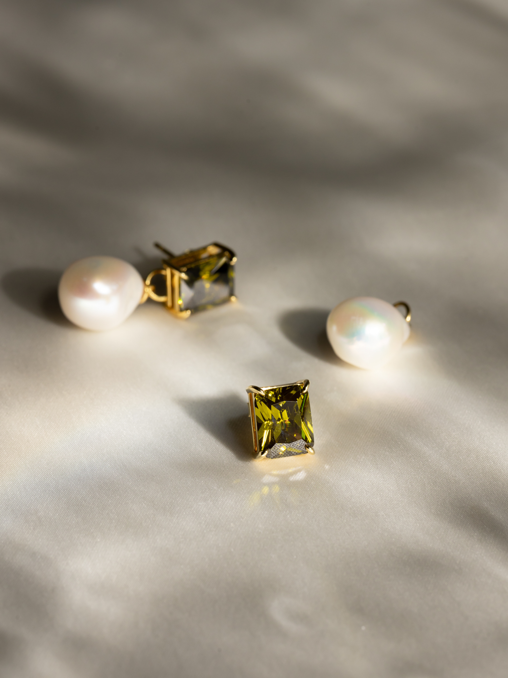 The CHRISTAL Modular Pearl Earrings showcase bold, oversized baguette-cut gemstones set in gold vermeil, with a detachable baroque pearl drop for versatile styling. Wear them as elegant studs or add the pearl for a refined, timeless look.